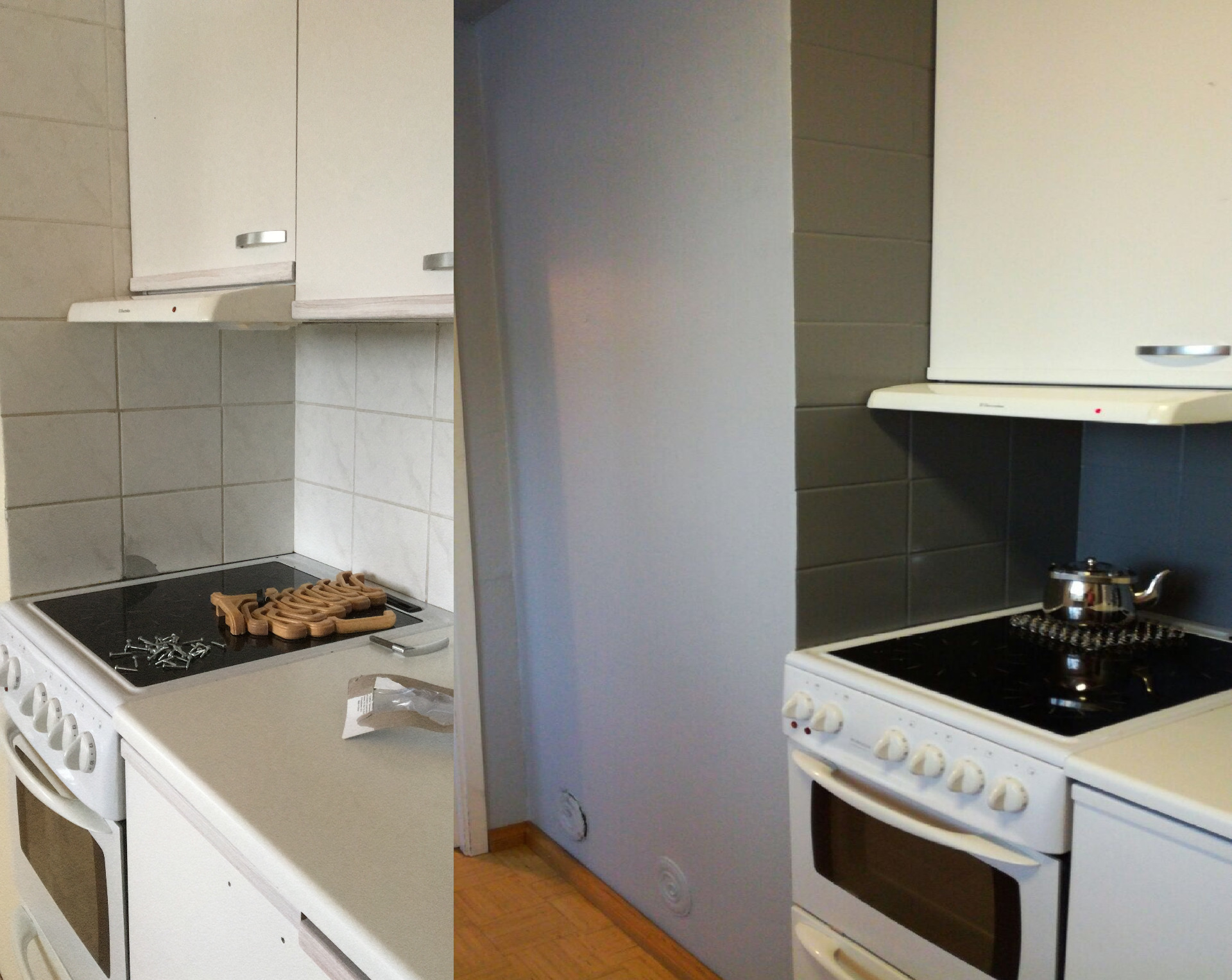 Rikkinäisiä laattoja ei aina tarvitse välttämättä vaihtaa. Tasoitetta ja maalia päälle niin keittiö on hetkessä kuin uusi.